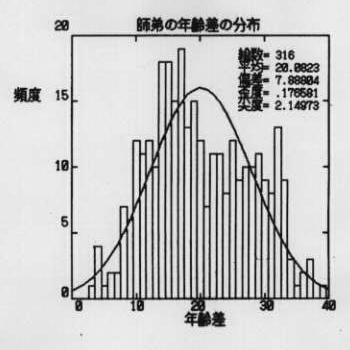 そういう意味で作成した「師弟の年齢差の分布」を図3に示す.すなわち図3の横軸は師匠と弟子の年齢差で(ただし若手の会の名簿の学年から推定しているものもあるので,±数年の誤差を持つデータも含まれている),縦軸はその年齢差を持つ師弟の頻度である.