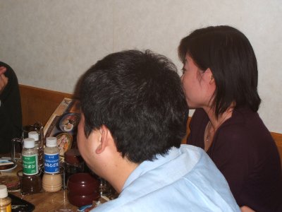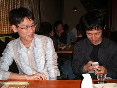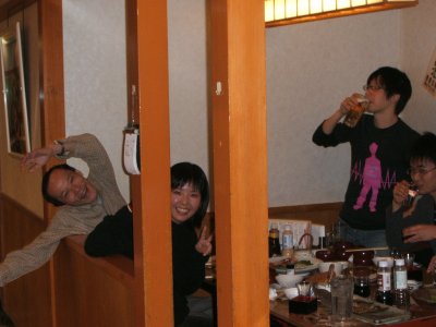 |  | 若手テーブル(笑)。 このときは写真撮るから何か芸をしろと言われたような気がする。 ぼくの前に座っている名大のAクンと東大のBクン (やっぱり名前忘れた)が壊れかけている。 周囲の毒気に当てられたらしい。 |