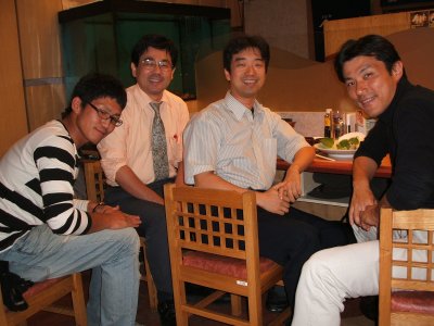 |  | シニアテーブル(怒られそう)。 左端に肩しか写っていないけど、 右側の粟野さんとはす向かいの田島さんに挟まれたコーナーには、 しっかりと京大基礎研の嶺重さんが座っている(!)。 手前は苦節十年の有本くん。 |