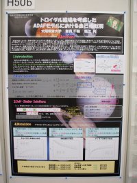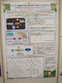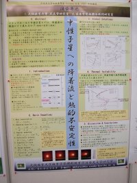 学会中日は朝から晩まで大忙し。 まず午前のセッションでは、 自分の発表があったけど、その前に、 第一子誕生予定で学会参加を断念した渡会クンの代理発表。 代理発表の最初には、もちろん、本人が欠席した理由と、 家族思いだと言うことを宣伝しておいて欲しいという 渡会クンの主張を聴衆に伝えておいた。 でも、前の晩に喋りすぎて、声が割れていた。 午後は、同じく高密度天体のセッションの座長。 パンクチュアルなのでなかなか気疲れする。 さらに、天文教育フォーラムの司会。 こっちはもっと気疲れした。 | |