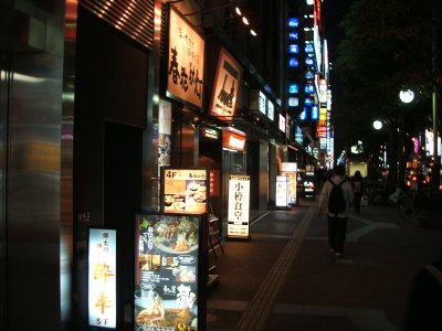|  | 夜はすすきのへ。 夜は、例によって、学会の懇親会はブッチ。 今回の懇親会はなかなか料理がよかったらしいが (でも、やっぱり、すぐになくなったらしい)、 とにかく一日中仕事して疲れたので、 座ってゆっくり呑みたかった。 |