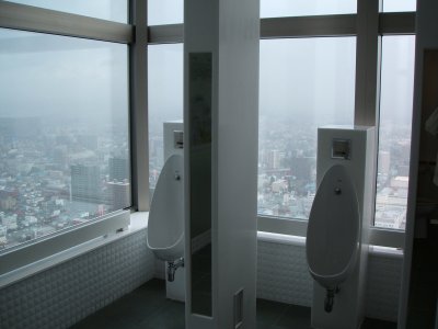 |  | JRタワーT38の展望階にあるトイレ。 展望階でトイレに入ったら、 男子トイレからも眺望できた。 逆に外からも見られるわけだが、 38階の窓の外にだれかいたら怖いだろう。 とくに夜なんか。 |