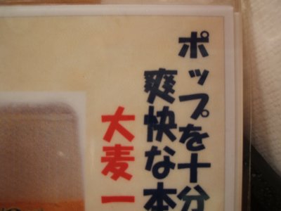 |  | 地ビールのポップ。 最後の締めのチャンチャン焼きは美味しかったが、 北海道の地ビールはいろいろ試してみたが、 それほど強い印象を受けなかった。 別にまずい訳じゃないけど、 銀河高原ビールや萩の村塾の方がかなり美味しい。 まぁ、 「“ポップ”を十分に効かせた爽快な本格派ビール」 というような“ポップ”が立っていちゃあかんよなぁ。 思いっきり間違っているし。 まさか、洒落じゃないと思うけど。 |