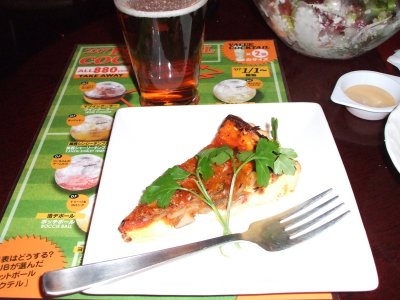 HUB名物キッシュ ビールは、ハブエール、ギネス、バスペールエール、 どれも美味しかったが、絶品だったのが、 トマトソース味のこのキッシュ。 雰囲気を楽しみながらゆっくり呑んでいたら、 いつの間にか1時間半も経っていた(笑)。 慌ててホテルに戻って宿題をやったけど、 夜中までかかってしまった(とほほ)。 |