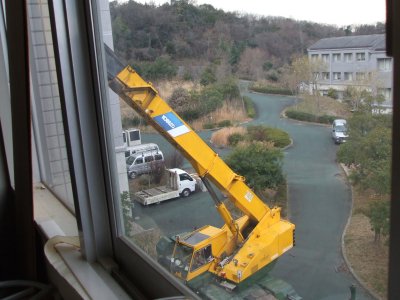 室外機やエアコン本体を、教員養成棟の分を何個もあげておくために、 クレーン車も来ていた。かなり大がかりである。 |