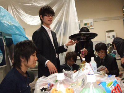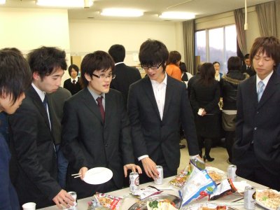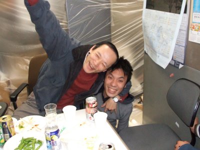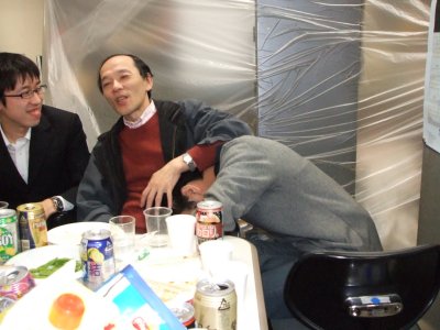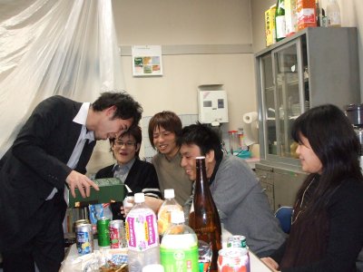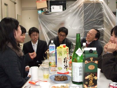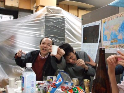 2次会@研究室 5時から始まった打ち上げパーティは、 8時前にお開きになり、後は、 研究室で2次会へ。 エアコンの交換がまだ途中で、 カバーだらけの中をとにかくテーブルを広げた。 |