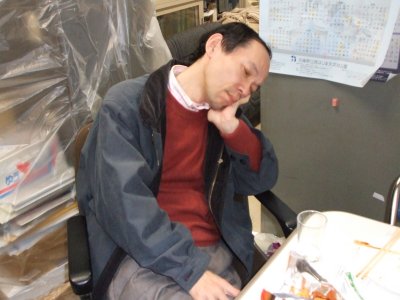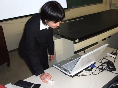 セット中の住友サン 発表準備中にプロジェクタが故障したりして、ばたばたし、 珍しく緊張気味だ。 |