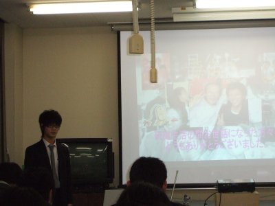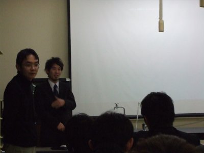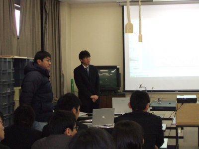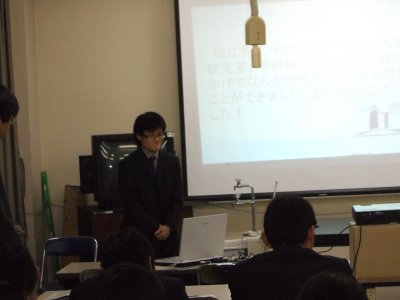 修論発表 いつもながら、危なげない発表。 もっとも、後で聞いたら、何を喋ったかまったく覚えていないそうだが。 |