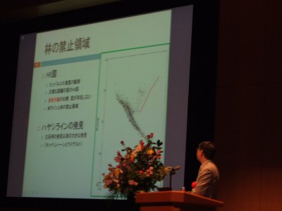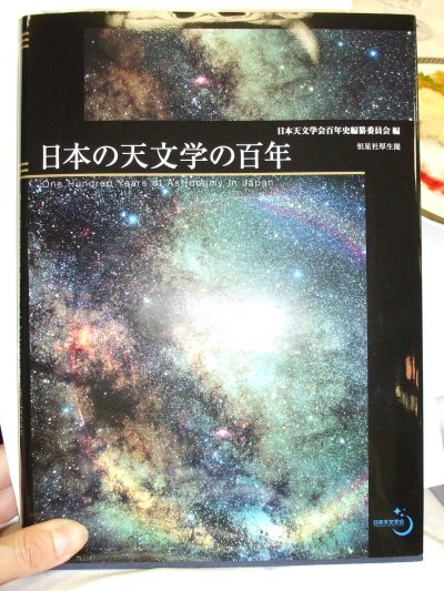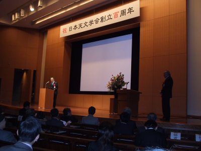 ・記念講演「天文学の百年」 尾崎洋二 東京大学名誉教授 つづいて、百年史編纂委員長の尾崎さんが、 天文学の百年間を1時間にまとめる記念講演をした。 日本天文学会百年史『日本の天文学の百年』のダイジェスト版である。 編纂委員なので、もちろん知っている内容だったりする。 ただ、上手にコンパクトに整理されていて、 まとまって聞くと、なかなか面白かった。 とくに有名な木村栄(ひさし)のZ項というものの話は、 時間をかけて紹介されたこともあり、やっとよくわかった (すぐ忘れるだろうけど)。 またビッグバン宇宙と太陽の共通点の話も面白かった。 すなわち、