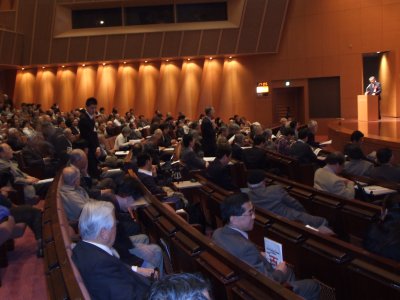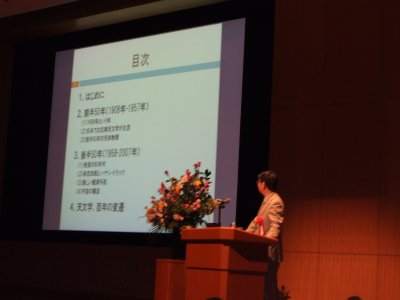 ・基調講演「日本天文学会百年の歩み」 土佐 誠 日本天文学会理事長 まず現在の理事長の土佐さんが、日本天文学会の百年の概要を講演した。 去年の秋に博多であった国際会議で、はじめて一緒に呑む機会があったのだが、 土佐さんはなかなかに酒飲みであった。閑話休題。 実は10数年前に趣味で学会の歴史を調べ、 『天文月報』に掲載したことがあるので、 ここらへんの話は割と詳しく知っていることだった。 (「天文学術誌の興亡:外伝/Prelude to Publications」1991年,天文月報,84巻,7月号,232頁)。 その記事は、土佐さんも冒頭で紹介してくれたが、 ちょっと昔を思い出してしまった。 話を聞きながら、スクリーンをチラチラ見ながら、 このテキストを打っているのだが、 ふと後ろを振り返ったら、花山天文台台長の柴田一成さんが、 ぐっすり眠り込んでいる(実況中継)。 |