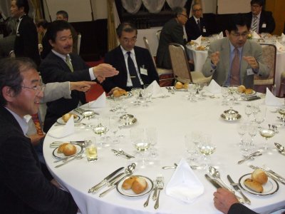 座る場所は決まっていない、割と面倒なフリー席だったが、 結局、来賓席のすぐ後ろ、広い部屋のど真ん中の一番いいテーブルに、 京都大学花山天文台の柴田さん、愛知教育大学の澤さん、 西はりま天文台の黒田さん、国立天文台の縣さん、渡部さんたちと座った。 こんなところにどーんと座るのは、ずうずうしい人間に決まっている。 |