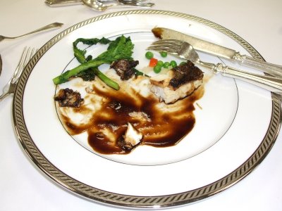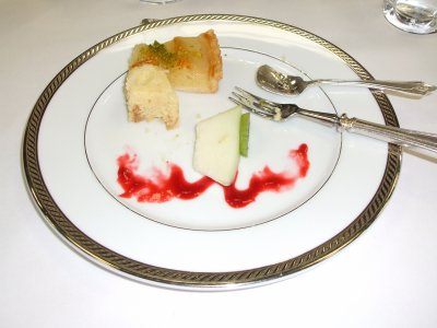 同時に出してもらえますか?と大人のニコニコ顔。 アントレ(でよかったかなぁ)は白身のムニエル? 少しずつ残したのだけど、やはり、無理、 アントレの肉の方はパスした。 最後はタルトなどデザート3種。 これもなかなかいけたぞ。 |