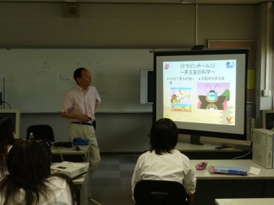 メインのパートでは、先生も生徒もSFやアニメが好きだということで、 SFアニメの天文学(だいたい、送迎の車でエヴァがBGMにかかってるし;笑)。 これはドラゴンボールの界王星の正体について話しているところ。 |