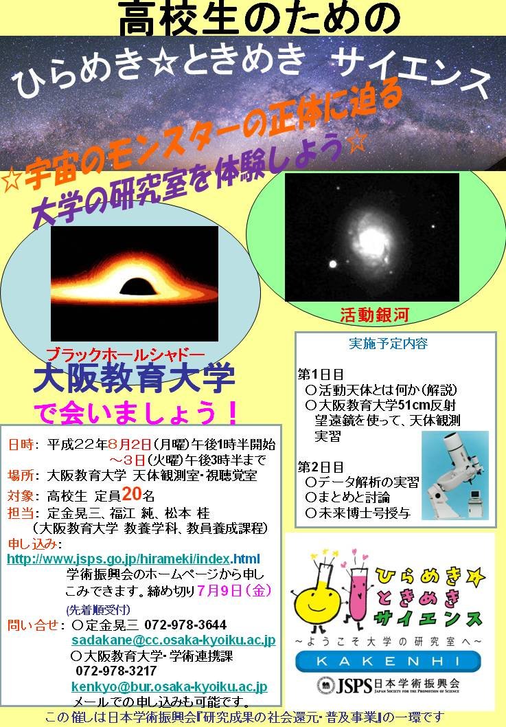 科学(学術)がもつ意味を理解してもらうプログラムだそうだ。 一昨年と昨年に引き続き、今年も、 うちの天文学グループ:定金・福江・松本で、この事業を実施した。 今年の募集タイトルは、 「宇宙のモンスター(ブラックホール)の正体に迫る」である。 今年の参加者は7人と少なかったが、 わざわざ名古屋からの参加などもあって、 夜もはじめて晴れて観望もでき、内容は濃かったかな。