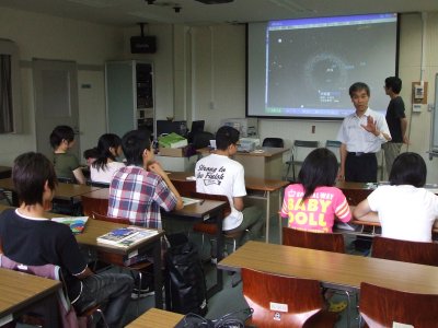 今年もB棟の視聴覚室で実施。 初日は、この後、ブラックホール活動天体の概論を講義し、 観測の概要の講義があって、夜に観測実習。 今年は天気がよくって、惑星など、いろいろ観望できたようだ。 |