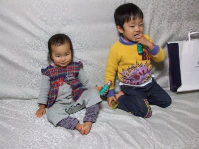 宇宙人ひびき(左)と宇宙怪獣あきら(右) とりあえず、動物にはエサを与えたけど、 話しに聞いたとおりに、この後、宇宙怪獣は大暴れ(笑)。 でも、棚の人形をいじろうとしたときは、 “それはダメ!”と一喝されて、ビビッていた。 |