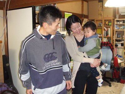 子連れ3組目 7時ぐらいに蜂屋一家が来訪。 奥さんとは初対面だったが、 オイオイ、こんな別嬪さんだとは聞いてないぞと、 とりあえず、蜂のいがぐり頭をグリグリ。 |