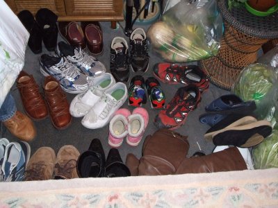 足の踏み場がない ははは、何足の靴があるやら。 数えてみたら、この段階で、大人14人+子ども4人が来ていることになる。 |
