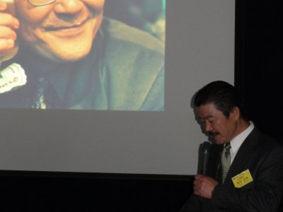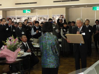 感謝状贈呈 パーティのところどころで、いろいろな関係者からのメッセージがあった。 これは真ん中へんで、兵庫県知事から感謝状の贈呈があったところ。 |