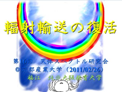 輻射輸送の研究分野は、恒星大気の研究が華やかなりし30年ぐらい前までは、 日本でも研究の流れがあったが、その後の数十年は冬の時代になっている。 ここらでいっちょう、復活しましょうよ、といった内容の話。 「輻射輸送の復活」 第16回天体スペクトル研究会(2011/02/26)PDFファイル(2.05MB)