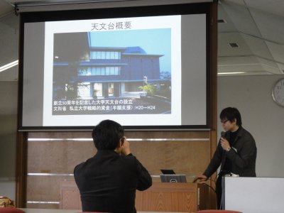 | 近隣で開催されるときにはたまに出る研究会だ。 今回は京都産業大学で開催されたので、近いし、 京産大の1.3m(F/10)荒木望遠鏡もまだ見ていなかったので、 どっちかというと望遠鏡を見学するために参加した。 もちろん、参加する以上は、何か発表しないともったいないし、 ちょっとばかり檄を飛ばしてきた。 | |