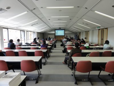 ホール自体は何百人か入りそうな大きなものだが、 研究会は3Fの第一セミナー室で開催された。 セミナー室も100人ぐらい入りそうな大きな部屋だ。 スペ研は参加者が30名ほどの小規模な研究会なので、 これは開催中に撮ったものだが、わりとまばらである。 |