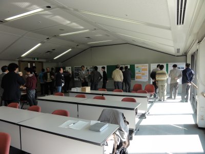 ポスタ−も4つぐらいあって、休憩時間はこんな感じ。 ほとんど顔見知りばかりの研究会である。 |