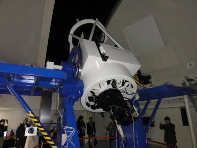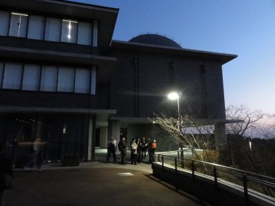 暗くてわかりにくいが、地下1階、地上3階の立派な建物。 専門の事務職員が3人も付いたという話。うちでは考えられない待遇だ。 ちょうど一般公開日の土曜日だったので、一般の人もすでに観望している。 |