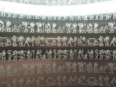観望室へ向かうエレベータ内には、 ヒエログリフがびっしりで、異界への入り口のよう。 |