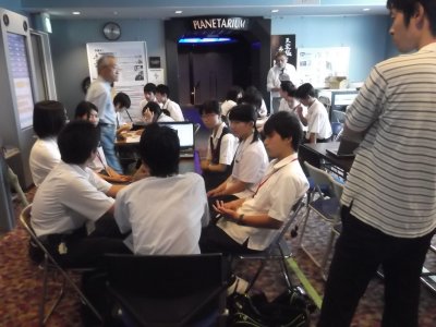 開場近くには高校生も50人ぐらい集まる。 この後、午前中は高校生はプラネタリウムの講義。 その間に、こちらは御飯食べたり、 館内の展示場を見学したりして時間をつぶした。 |