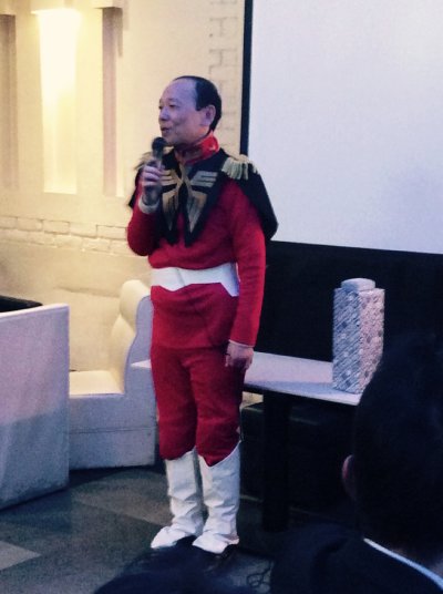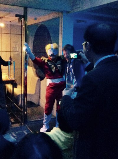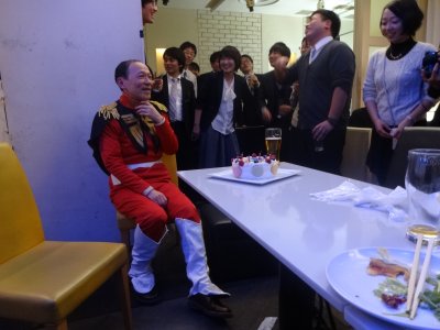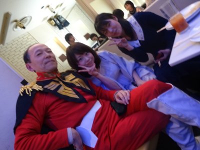 還暦のシャア 十数分の間に、とても恥ずかしいことが起こったらしい。 衣装の提案は株ちゃん、手配は元ちゃんだったらしいが、 まぁ、よく思いつくもんだ。 |