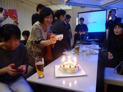 撮影タイム みんな、つぎつぎにケーキを撮影に来る。 ローソク、保つか!? |