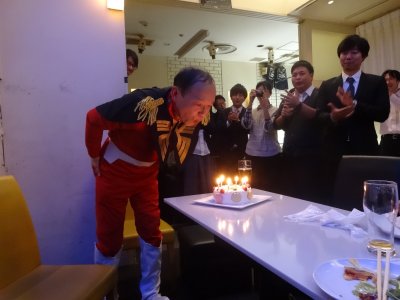 オーダーメード つぎつぎとショータイムというか、イベントの嵐で、 これは不惑・天命とケーキをもってきてくれた山田くんが、 今回も特注してくれたケーキ。 |