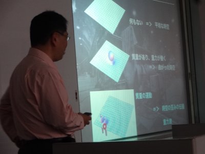 最後は天文講演会で、司会は渡部さん。 この段階では、数割の人は帰るので、 会場は少しゆとりができている。 |