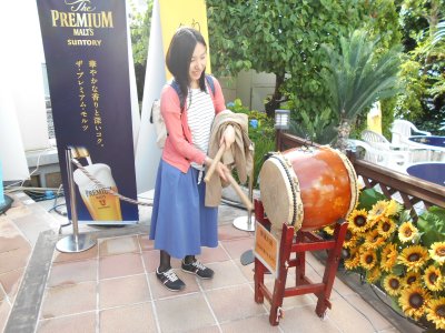 ビアガーデンイン入るときは出陣太鼓を打つことになっているらしい。 |