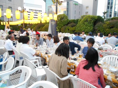 会場片づけが終了しても4時半。 今年は大阪市大のグループと合同で、 総勢12人の呑み会になる。 久しぶりのビアガーデンだ(向かいのビル屋上)。 |