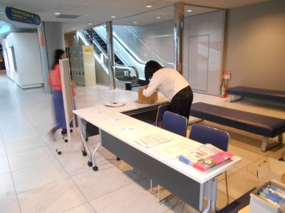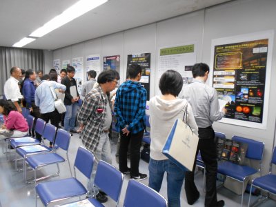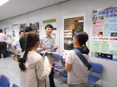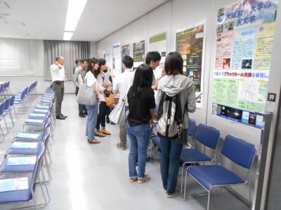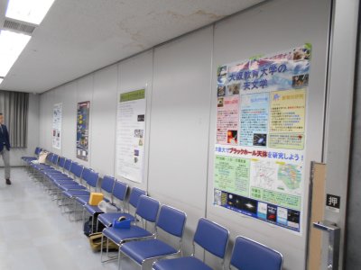 9時半ぐらいには、ポスターボードや受付など設営が終わる。 今年は学生がうちと大阪市大と合わせ8人もいて、さくさくと準備も終わった。 そろそろ科学館が開館する時分だろう。 |