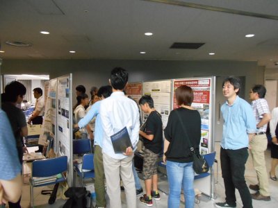 午後のポスターセッションも、午前と変わらぬ賑わい。 もっとも昨年に比べて人数が半分程度なことを反映してか、 教育大のポスターで説明したのは3,4人ぐらいだったかな。 でも、中には熱心な子もいて、 ひらめき☆ときめきサイエンスにも関心を持ってくれた。 |