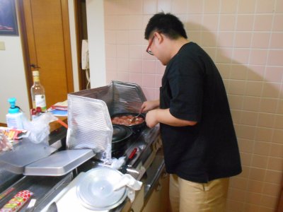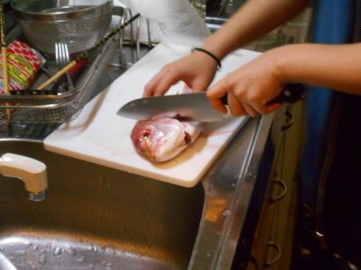 いよいよ2日目夜は恒例の料理大会。 今年は鯛の丸ごとを買ってきて、 漁師の孫娘がきっちり捌いている。 |