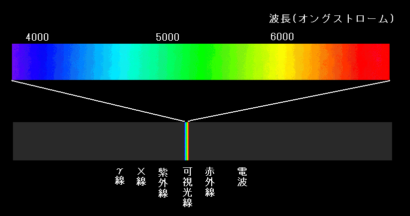 | ラジオの信号を運ぶ電波や身体を透視するX線など光の仲間を総称して, 電磁波(electromagnetic wave)と呼びます. 目に見える可視光線(optical light)も電磁波の一種です. |