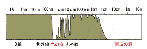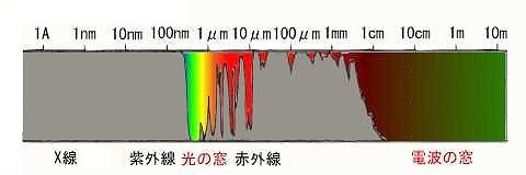 長波長の電波は電離層によって宇宙空間に反射されてしまいます. 約1mmから10mの波長の電波は, あまり吸収されずに大気を通過します. 1μmから約1mmまでの近赤外線からミリ波領域は, 大気上層の水蒸気や二酸化炭素分子によって,かなり吸収されます. 300nmから1000nmの可視光に対しては,大気はほぼ透明です. 紫外線はオゾンなど大気中の分子に吸収されます. X線は大気中の原子に,ガンマ線は大気中の分子の原子核に吸収されます. 結局のところ,<大気の窓>としては,比較的広い窓として, 波長1mmから30m付近に開いた電波の窓と, 300nmから1000nm付近に開いた光の窓があることがわかります.
