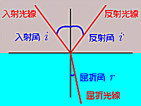 空気と水など異なる物質の境界面に入射した光は, 一つの媒質から別の媒質に入ったときに屈折 (refraction)します. 境界面に垂直に立てた垂線と入射光線のなす角度を入射角(angle of incidence), 垂線と屈折光線のなす角度を屈折角(angle of refraction)と呼びますが, 入射角と屈折角の間にはスネルの法則 (Snell's law)と呼ばれる関係が成り立ちます. |