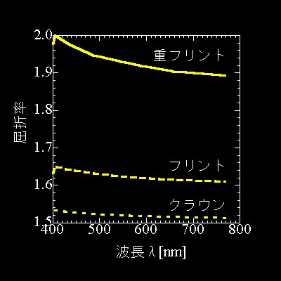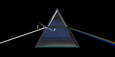 これは光の屈折率が波長によって異なるためです. ガラスなど物質の屈折率 n は, 光の入射角(incident angle)を i, 屈折角(refraction angle)を r とすると,