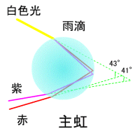 虹 (rainbow)は,大気中の水滴が太陽の光を屈折して生じます. 光の波長が違うと,水滴の中で屈折される角度が少しずつ異なるために, 七彩の虹になります.