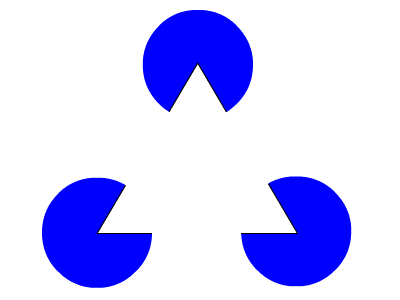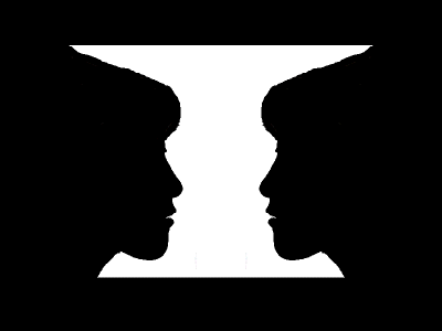 左の図は,あるときは白い高杯に見えたり, あるときは向かい合った人の横顔に見えたりします. 白い部分が意味のある図形(高杯)として見えたときは, 白い部分が前面にあるように見え, 黒い部分は背景となって奥に引っ込んだ感じになります. 逆に,黒い部分が意味のある図形(横顔)として見えたときは、 白い部分は背景となって奥に引きます. ゲシュタルト心理学では, このような現象を「図地反転」と呼んでいます. |