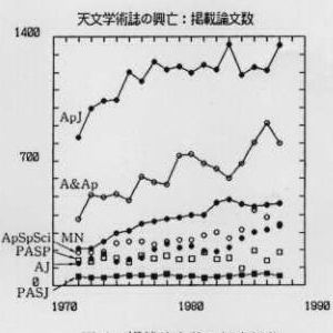 さて前回指摘した傾向は,だいたい今回も同じでした.すなわち,@ApJの掲載数は頭打ちで,雑誌としては(物理的)限界に近いようです.AA&ApやMNは伸びています.BPASJやPASPは横ばいです.Cその他として,煩雑になるためグラフには示していませんが,AZhはPASP程度の掲載数でほぼ横ばい,PTPは引続き微減傾向,そしてSPは波があります.