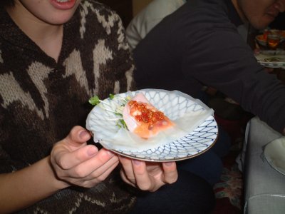指導中: ベトナム風春巻きの作り方指導byマノちゃん. ヒゲのおっさんは食前酒ですでに真っ赤. |