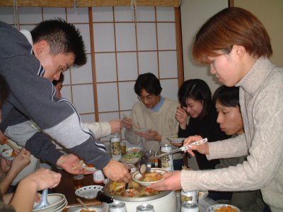 戦闘開始: できあがった料理を我先に取り合っている. パエリアもトムヤムクンもあっと言う間に消滅. |
