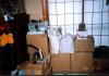居間の床の間のあたりに, まだダンボールや未開封の梱包物が残っている.
