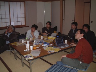 昼の部. みんなノートパソコン持ち込んで, 浅里さんが持参した液晶プロジェクタでプレゼン. 便利な時代になった. |